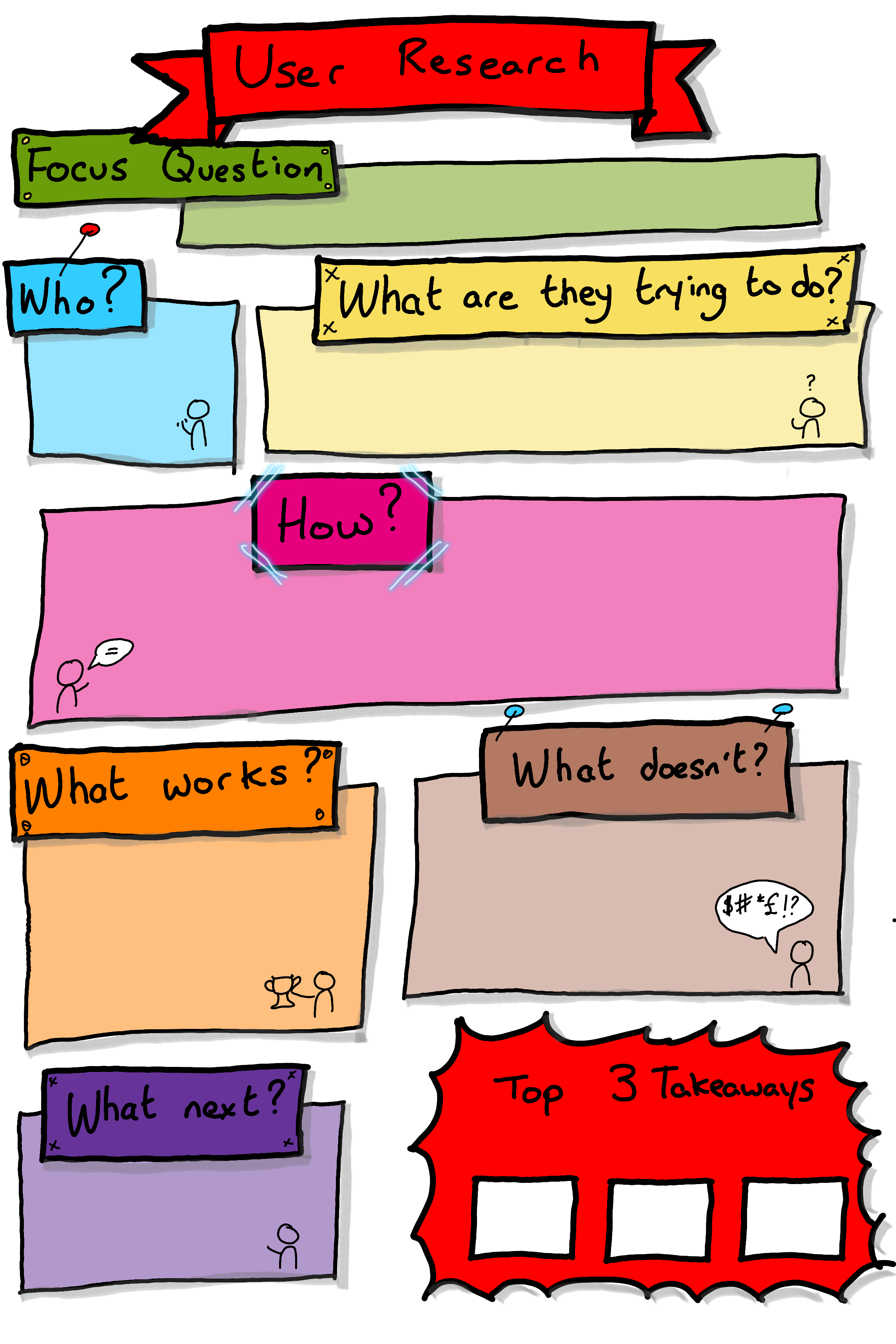 The top half helps me stay focused on the user's goals: "What are they trying to do?" And the bottom half is for capturing what's working ("What works?") and, critically, what isn't ("What doesn't?").